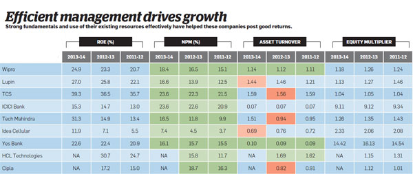 Tata Consultancy Services, the land's largest visitor by market capitalisation, also ranks loftier in terms of management efficiency. The software giant'due south RoE has increased from 35.seven% in 2011-12 to 39.3% in 2013-14, along with a jump in profit margin from 21.five% to a healthy 23.half-dozen%. A depression disinterestedness multiplier indicates that the visitor relies more than on turn a profit margin to generate returns for its shareholders. HCL Technologies, a smaller rival to TCS, ticks all the check-boxes when it comes to efficiency. Its RoE has expanded from 21.v% in 2010-11 to xxx.seven% in 2012-thirteen according to latest data available. It enjoys the highest nugget turnover amid its peers, which has contributed to its returns apart from a rise internet profit margin. Wipro also comes up trumps on all parameters, even so enjoys a lower RoE than nearly of its industry peers.